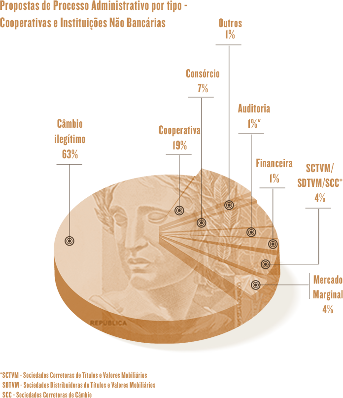 A autoridade monetária também deliberou sobre 81 propostas de instauração de processo administrativo contra cooperativas de crédito e contra instituições não bancárias. Dessas, 78 foram aprovadas e três foram arquivadas. Sobre esses segmentos, 63% das propostas aprovadas envolveram pessoas físicas e jurídicas responsáveis por operações de câmbio ilegítimo, ou seja, trata-se de espécie de mercado marginal.